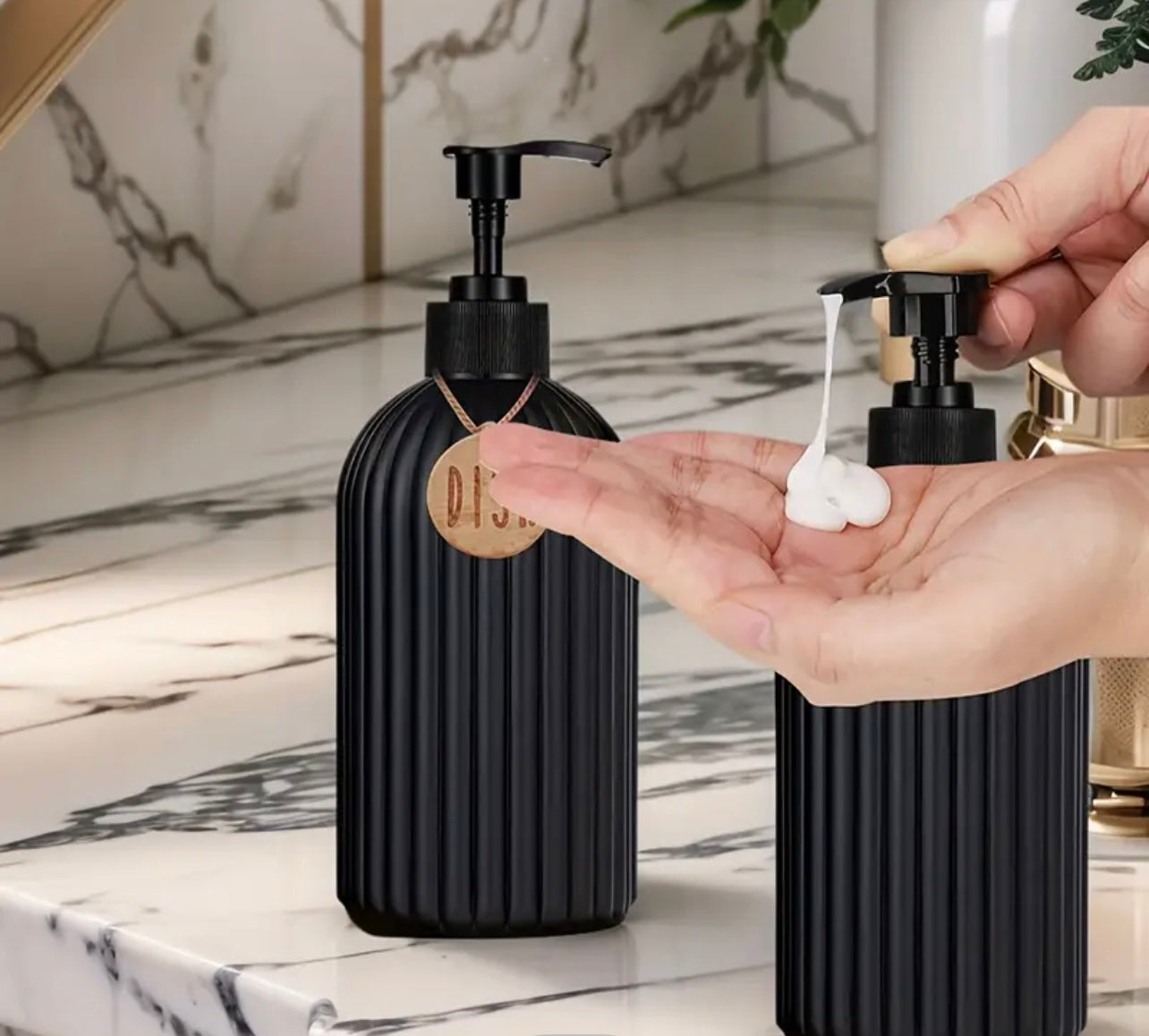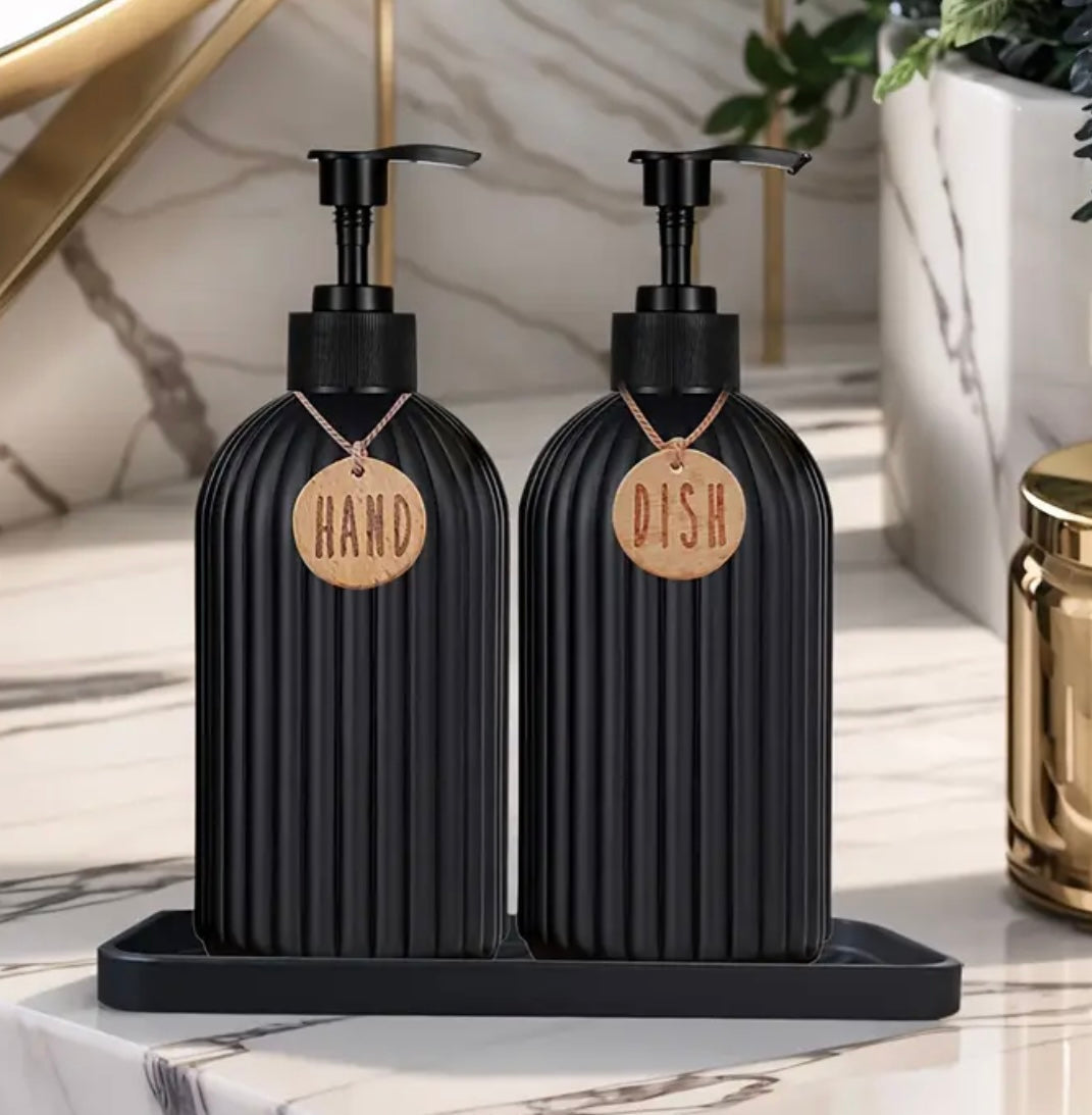 2 stk påfyllbare flasker i riflet sort plast med treskilt navnet med `dish` og `hand`